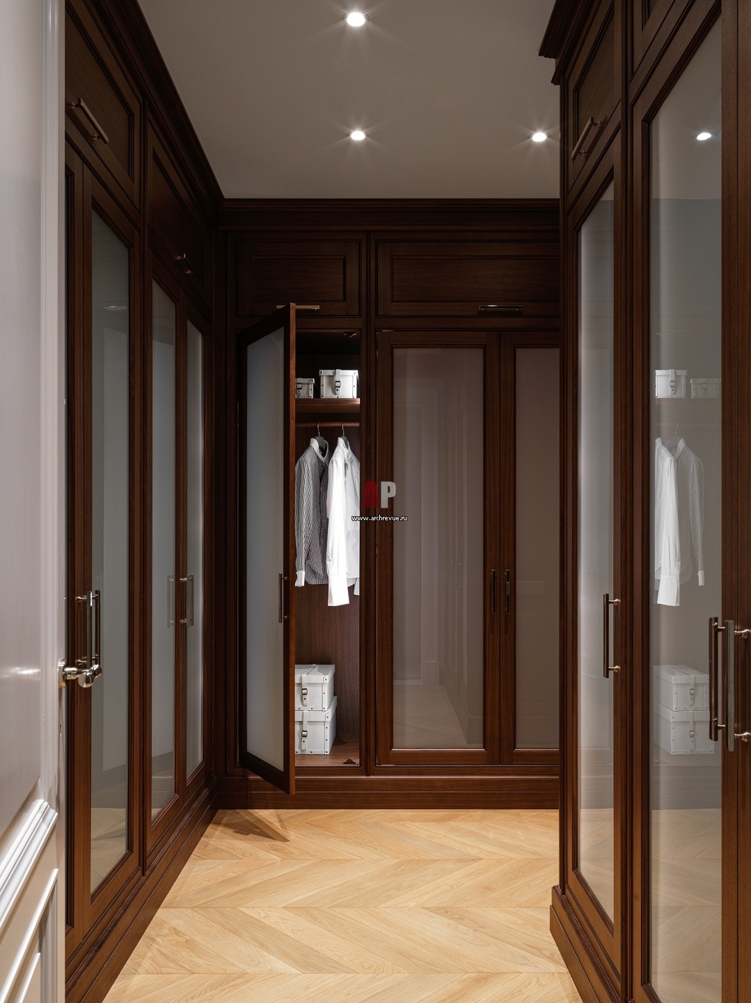 Мужская гардеробная расположена рядом с кабинетом. Ее особенность – шкафы из темного дерева с филенчатыми фасадами из смарт-стекла. Стеклянные дверцы выглядят матовыми при естественном освещении, при включении подсветки они становятся прозрачными.