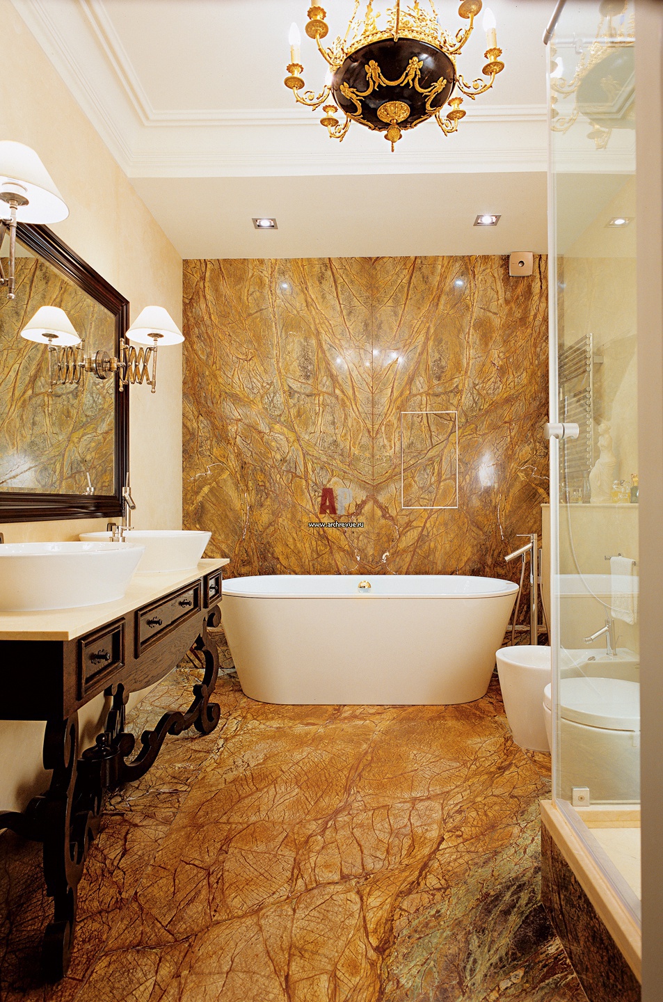 Стена и полы помещения облицованы редкой красоты мрамором Бидасар, изготовленным и смонтированным «Сезам-Т». С ним гармонично сочетается созданная по авторским эскизам барочная мебель и лаконичная сантехника, поставщик Konzept.