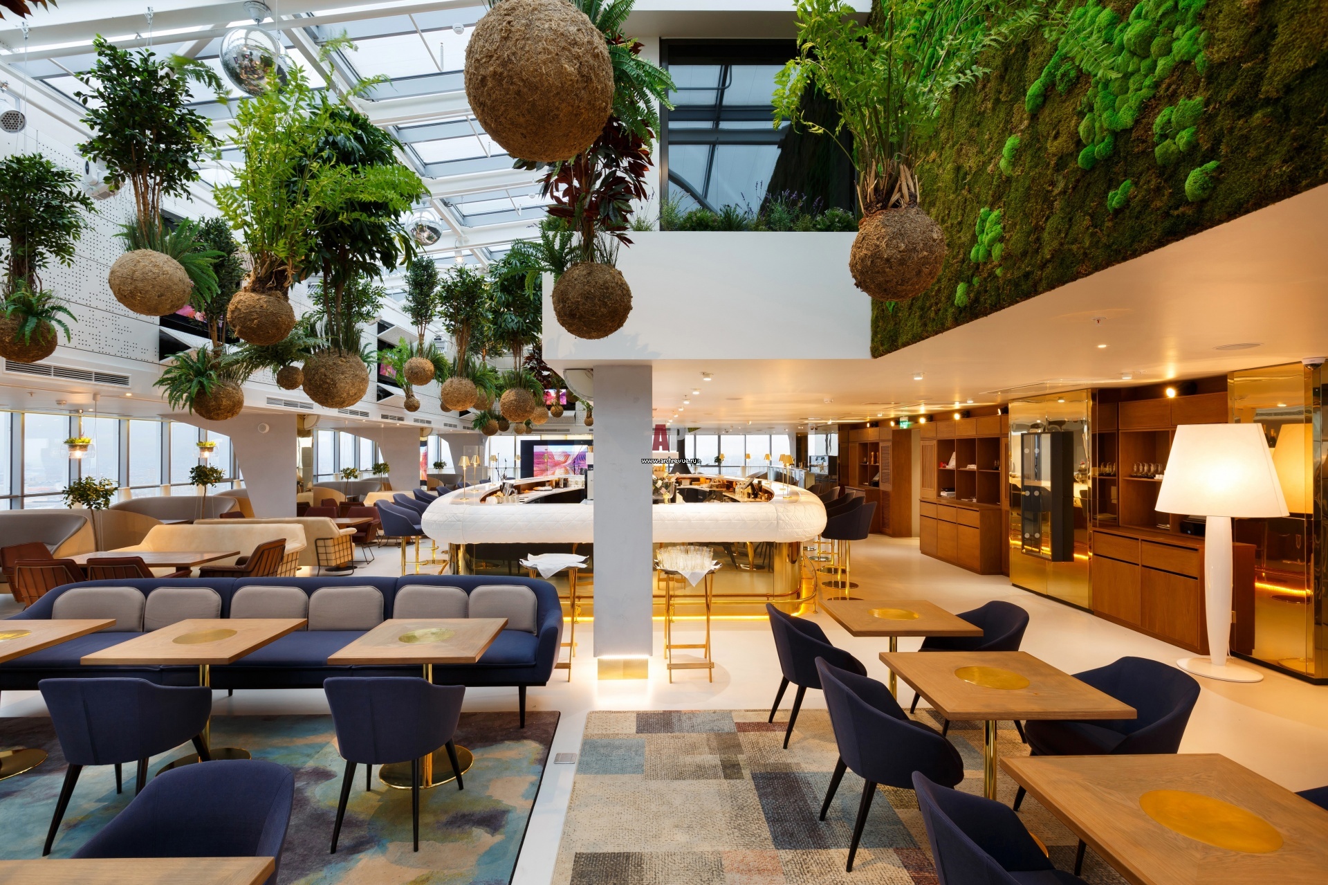 Пространство ресторана решено в современной стилистике, лаконичный фон с белыми стенами, наливными полами, стеклянным атриумом и панорамными фасадами эффектно контрастирует с дизайнерской мебелью разных форм и цветов.