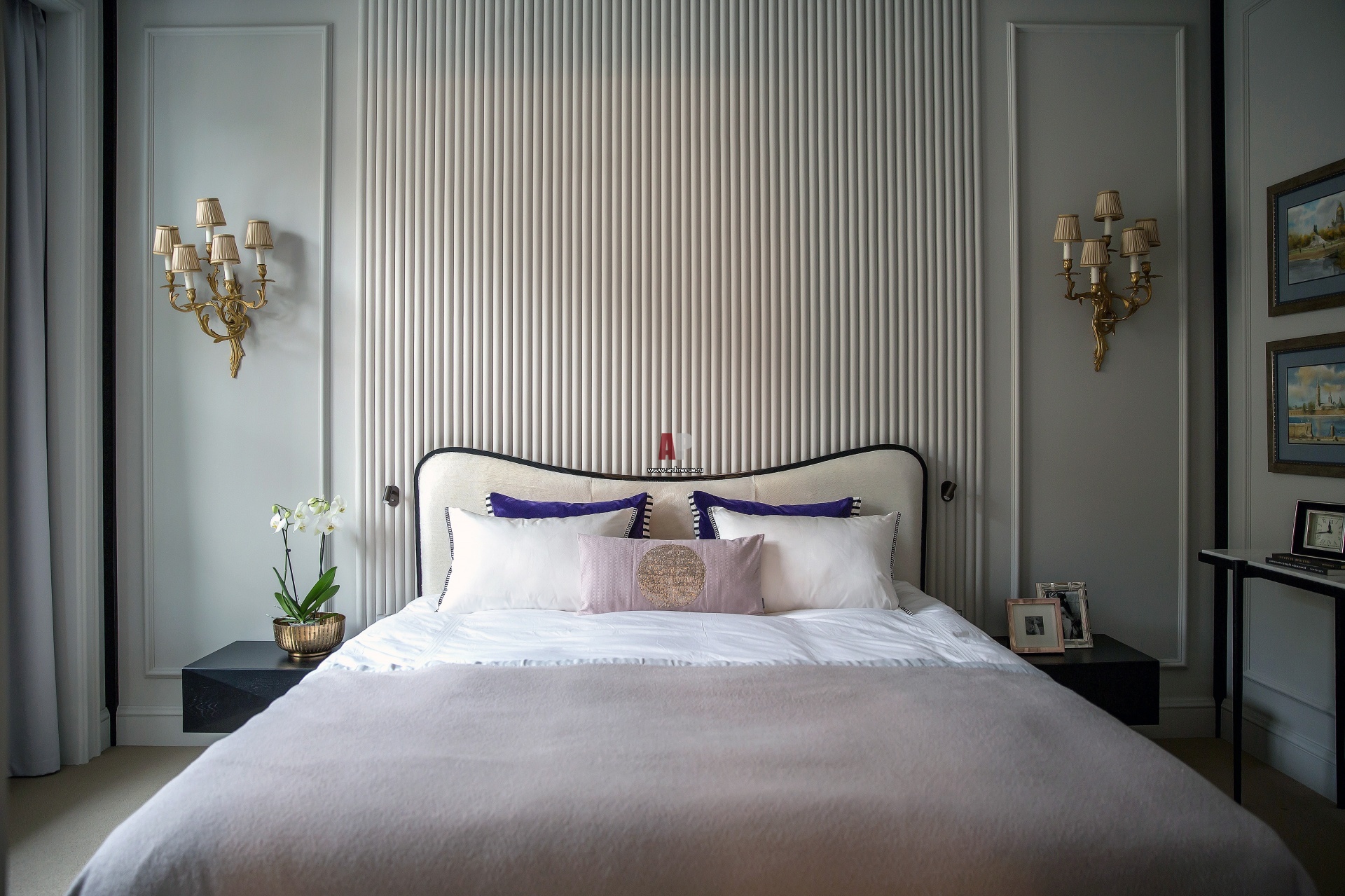 Интерьер спальни в сиренево-жемчужных тонах. За изголовьем кровати – гипсовое панно с вертикальным рисунком. Кровать с изголовьем, обтянутым шкурой коровы, прикроватные тумбочки сделаны на заказ. Золотые бра, антиквариат.