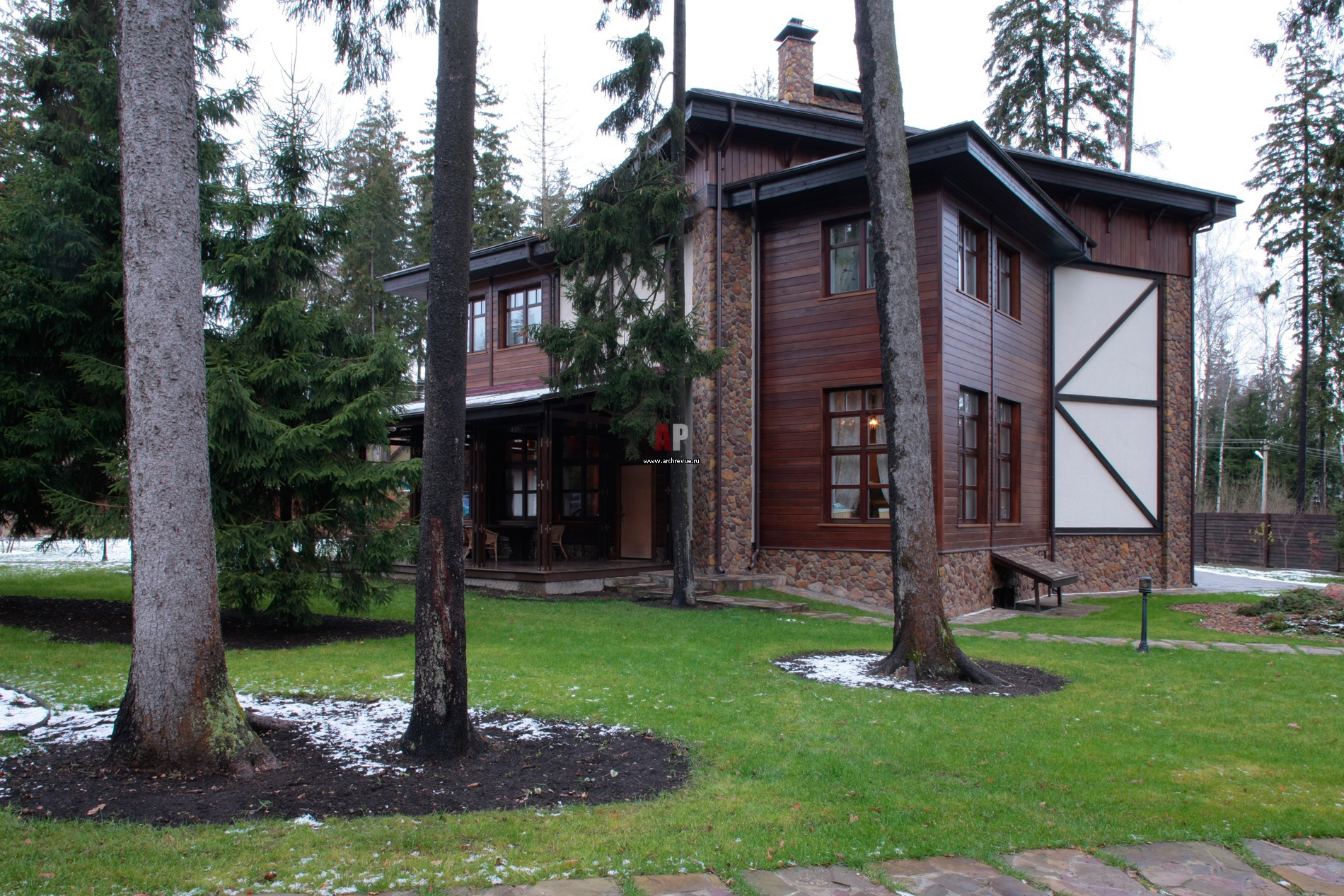 Фасад дома подвергся серьезной реконструкции. Чтобы придать дому облик альпийского строения, архитекторы облицевали фасад плиткой с эффектом каменной кладки и зашили его темным деревом.