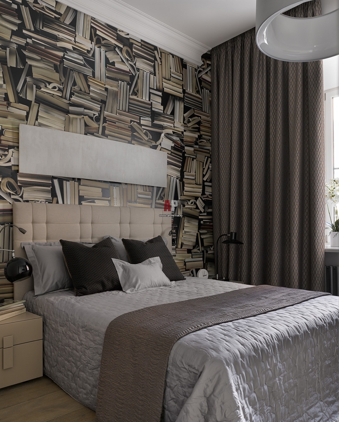Мужская квартира в бывшем доходном доме в центре старой Москвы. Интерьер спальни. Кровать и прикроватные тумбы, ALF.