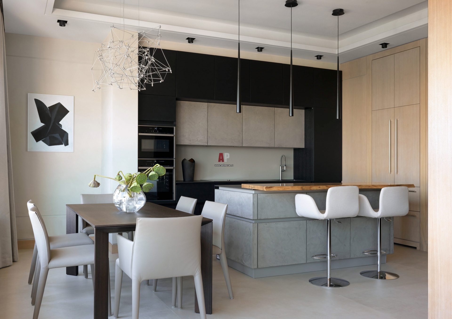 Кухня-столовая выполнена в минималистском стиле. На полу – бесшовный керамогранит с фактурой бетона размером 150х300 см и толщиной 6 мм. Обеденный стол, Poliform. Стулья, B&B Italia.