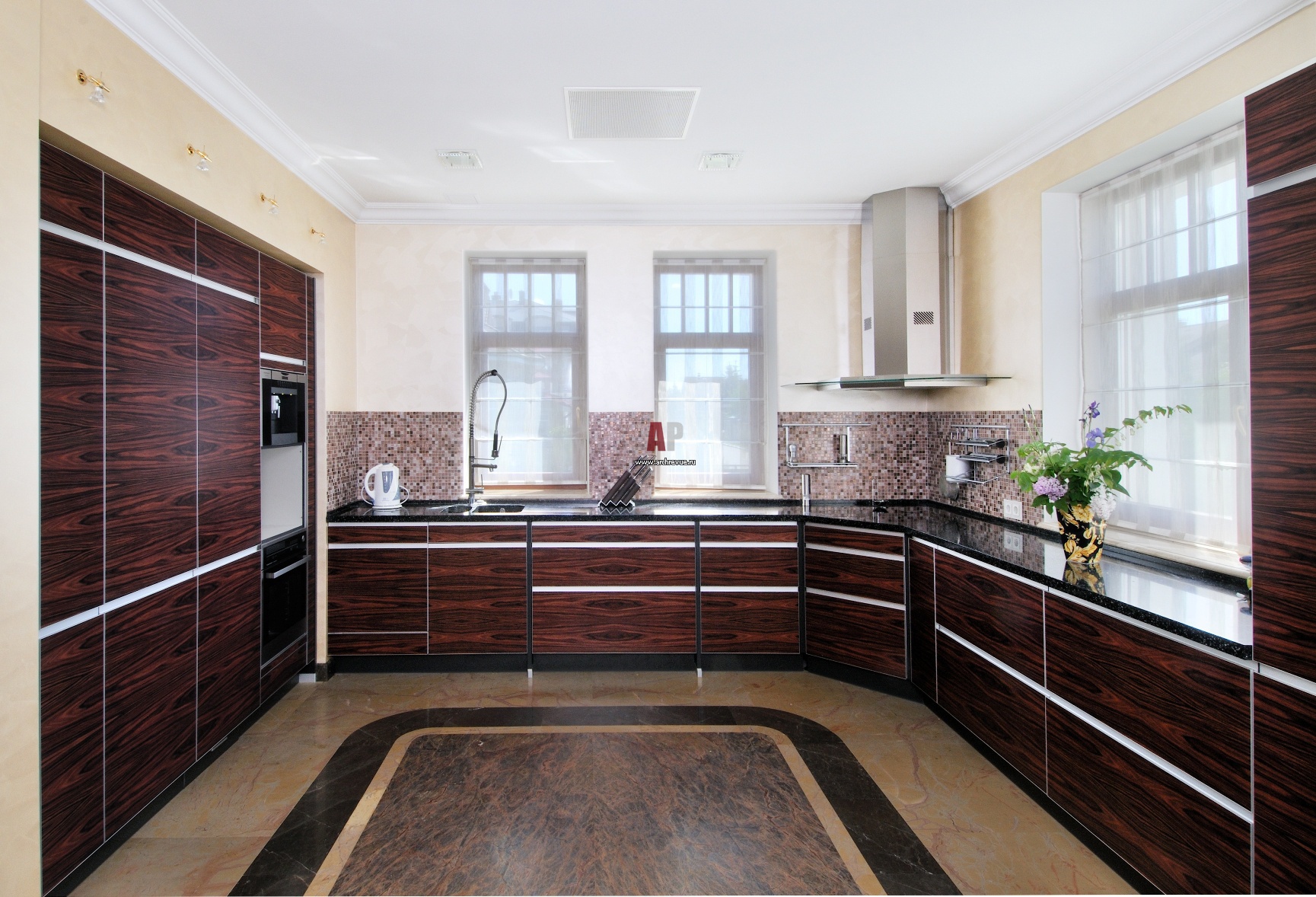 Кухня, примыкающая к столовой зоне, решена в той же сдержанной и роскошной стилистике. Кухонная мебель встроена, кухонная техника Miele.