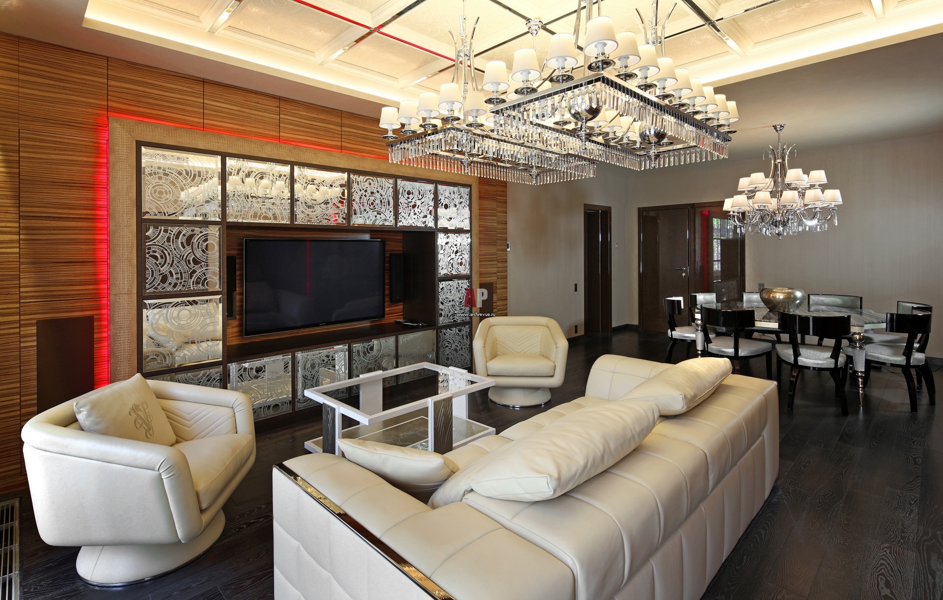 Малая гостиная с зоной домашнего кинотеатра. Потолок оформлен кессонами с зеркальными вставками. Стена за ТВ декорирована зеркальными элементами с авторским рисунком, они обрамленными деревянными панелями из шпона зебрано, изготовление, «КингВуд». Диваны, Visionnaire.