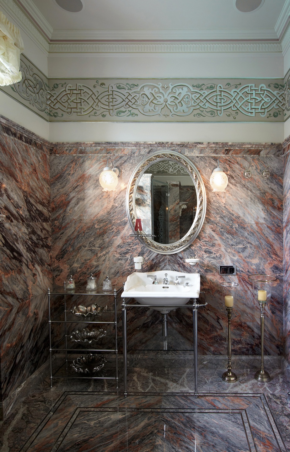 Ванная комната декорирована панелями из розового мрамора. Верх стены украшен фризом, расписанным вручную.