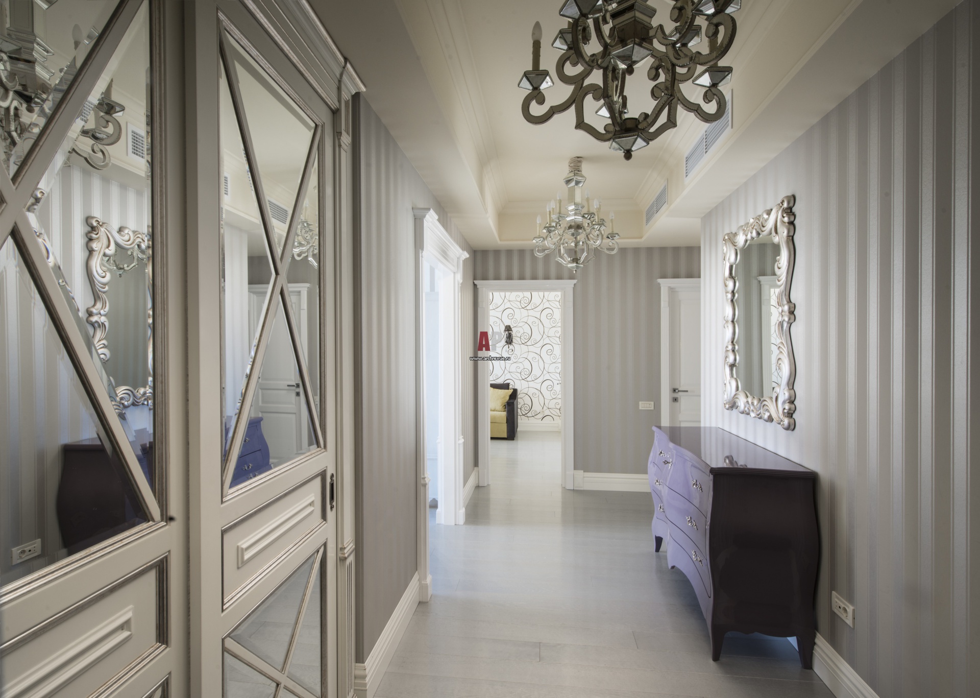 Фото интерьера прихожей в серебристо-серых тонах. Встроенный шкаф с зеркалами от Luciano Zonta.