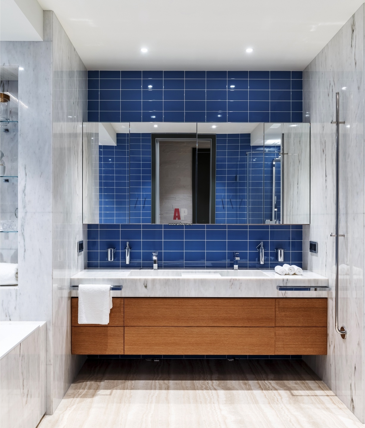 Семейный пентхаус в Хамовниках. Интерьер детской ванной комнаты. Две раковины выполнены из камня и объединены общей столешницей. Смесители, Nobili.