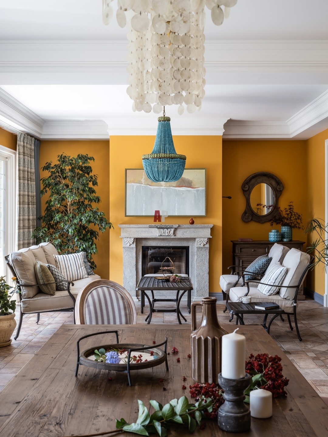 Центральный акцент зоны отдыха первого этажа – камин с живым огнем. Его портал выполнен из состаренного камня в духе старинного европейского шато. Необычная бирюзовая люстра из бусин привезена из Америки. Мебель в диванной зоне специально выбиралась из коллекции outdoor, чтобы ее можно было при желании выносить к бассейну.