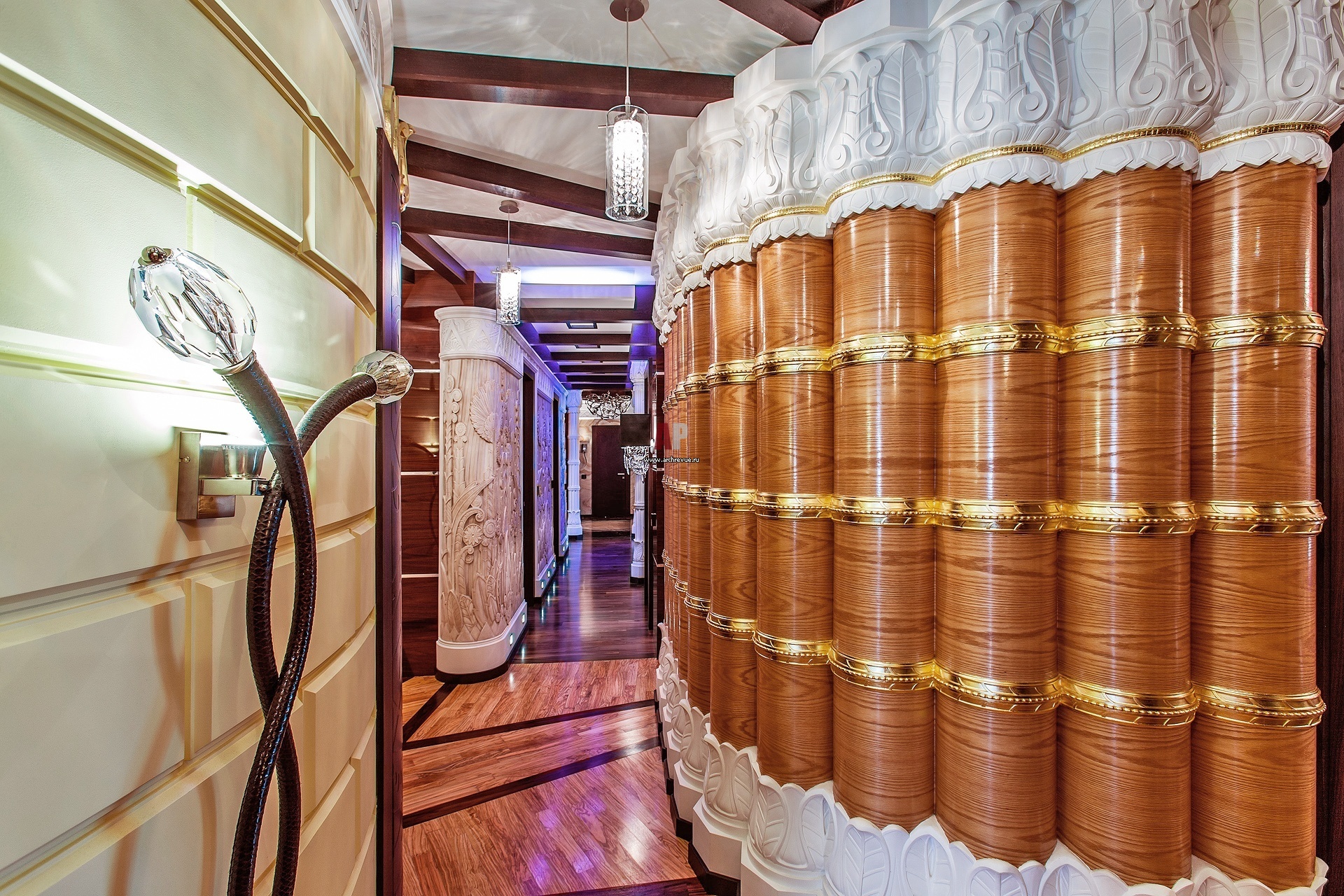 Чтобы скорректировать форму жилых помещений, одна из стен в приватном холле сделана радиусной. Колонны выполнены из полированного шпона палисандра и украшены позолотой, капители – гипсовые. Бра, Sigma L2.