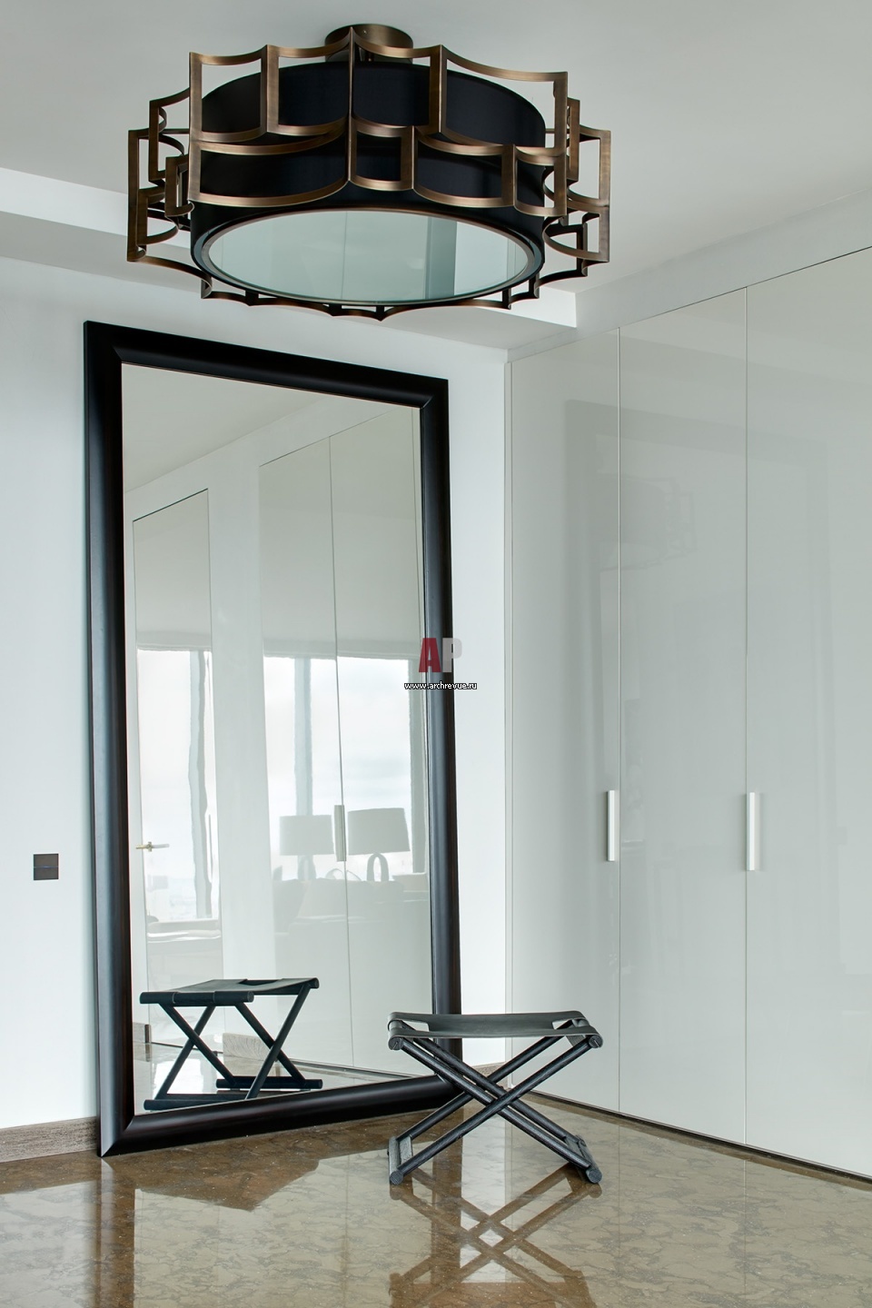 Квартира в минимализме на Мосфильмовской. Интерьер прихожей. Люстра, Wired Custom Lighting. Встроенный шкаф выполнен в одном цвете с отделкой стен. Табурет, Christian Liaigre, модель Bazane.