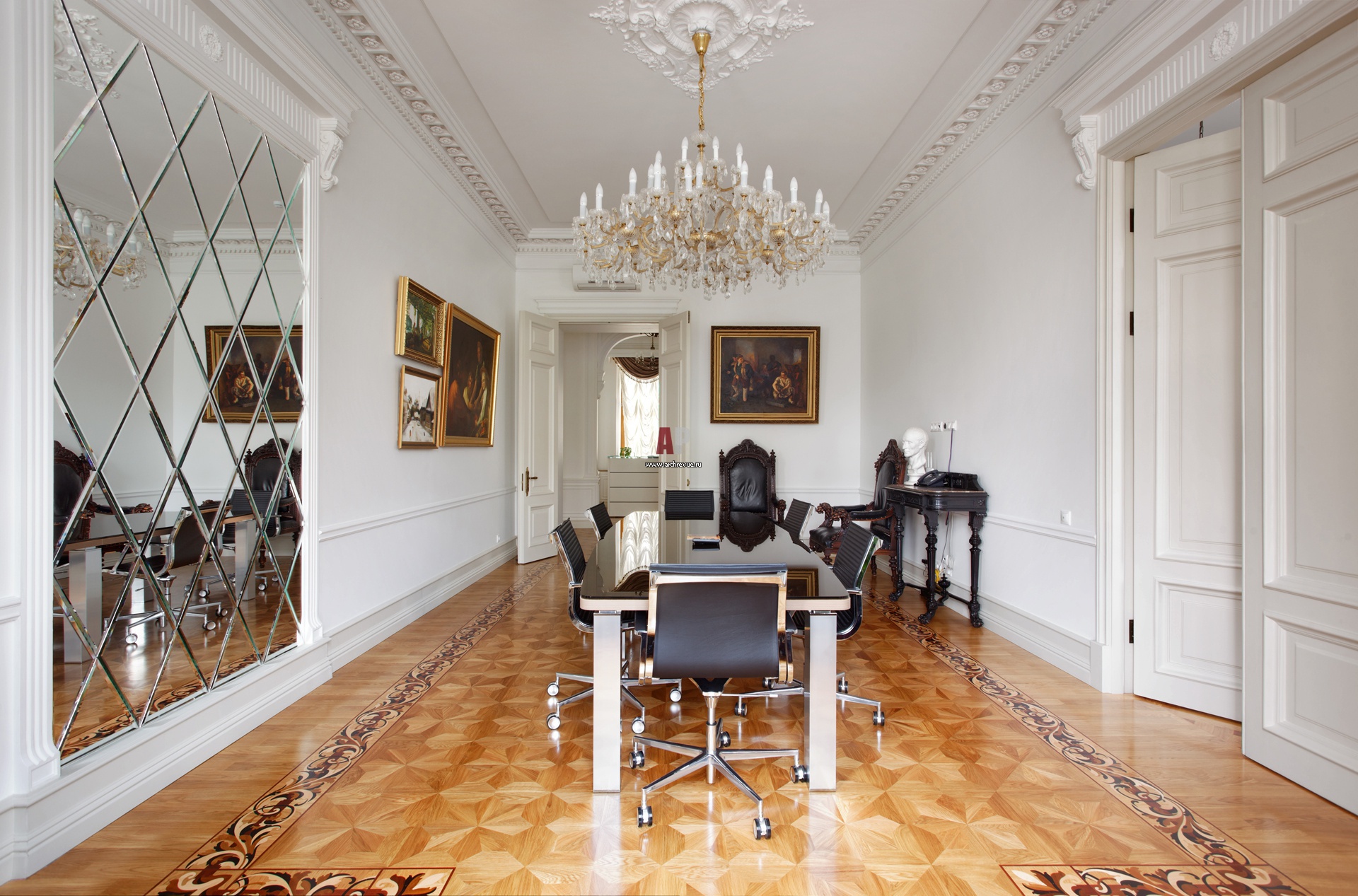 Конференц-зал офиса. Модульный паркет William J. Hunt из древесины ироко. Декоративные бордюры из сукупиры, ореха, карельской березы, мербау, клена и венге.