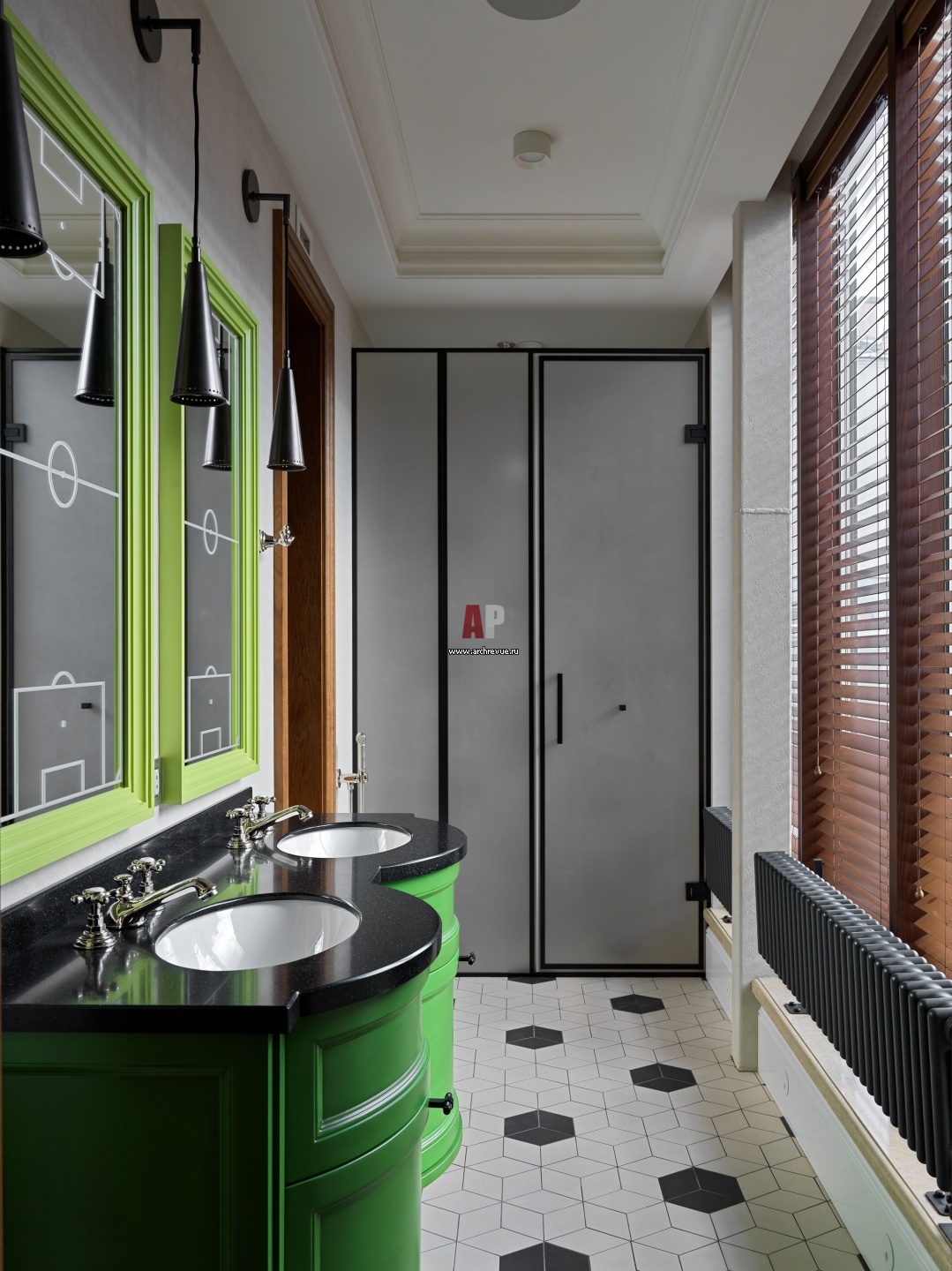 Ванная комната мальчиков. Идея интерьера – любовь к спорту, особенно к футболу. Сантехника, Villeroy & Boch.