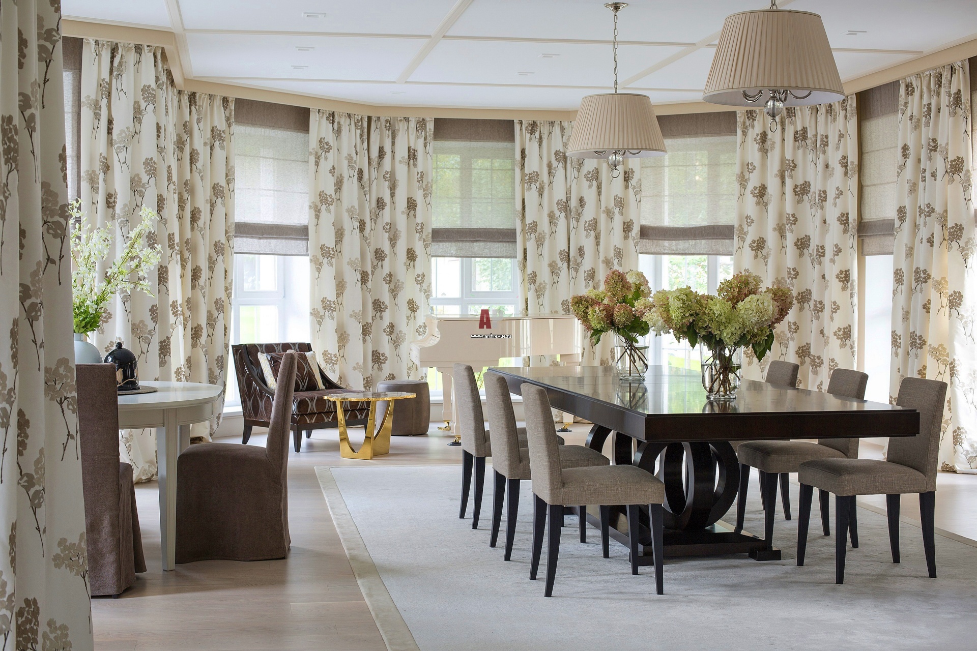 В парадной столовой присутствуют элементы традиционного усадебного интерьера. Стол и комод, Selva. Окна с выходом на открытую веранду обрамлены портьерами с цветами.