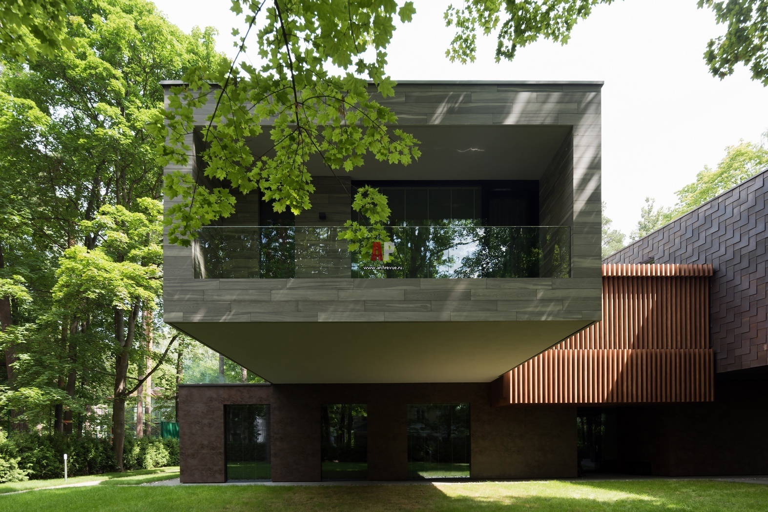 Частный дом в Серебряном Бору. Участок 20 соток имел ограниченное пятно застройки, поэтому при проектировании было решение большую часть помещений разместить на втором этаже, подвесив объемы консольно. Так появилась парящая восьмиметровая консоль.