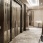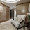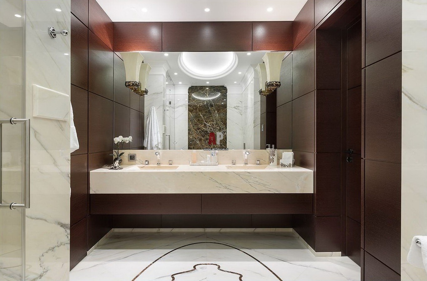 Хозяйская ванная комната отделана светлым мрамором и стеновыми панелями из шпона ореха.