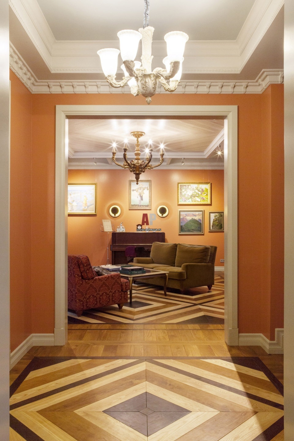 Яркий акцент общей зоны – рисунок полов. Наборный паркет с использованием венге, ясеня и российского дуба с разной тонировкой уложен в щиты размером 2Х2 метра. Бордюры из венге по периметру гостиной и холла 40 мм и 75 мм.