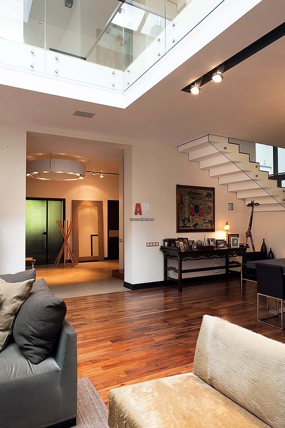 Вид из гостиной на прихожую и лестничную группу. Чтобы сохранить полезное пространство в гостиной, один пролет лестницы выведен в зону столовой.