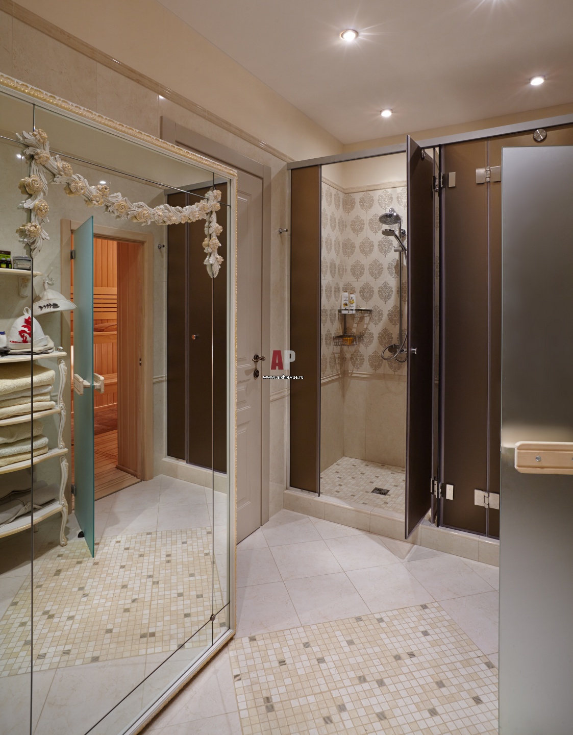 Банный комплекс с сауной и душевой на первом этаже деревянного дома. Сантехника, Villeroy & Boch.