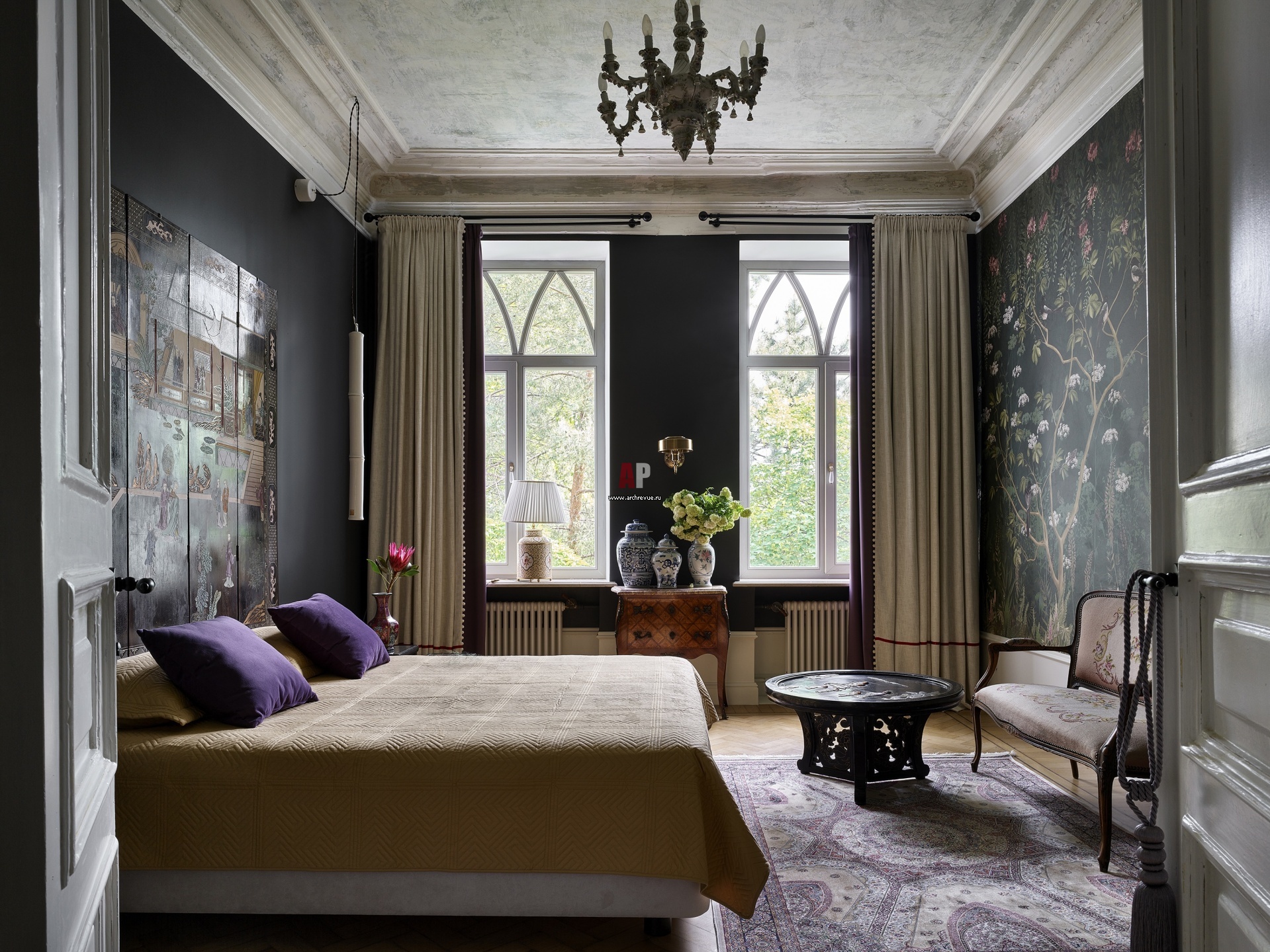 Хозяйская спальня оформлена в темных тонах. Мебель, ширма, люстра, картины, вазы, зеркало, антиквариат и винтаж.