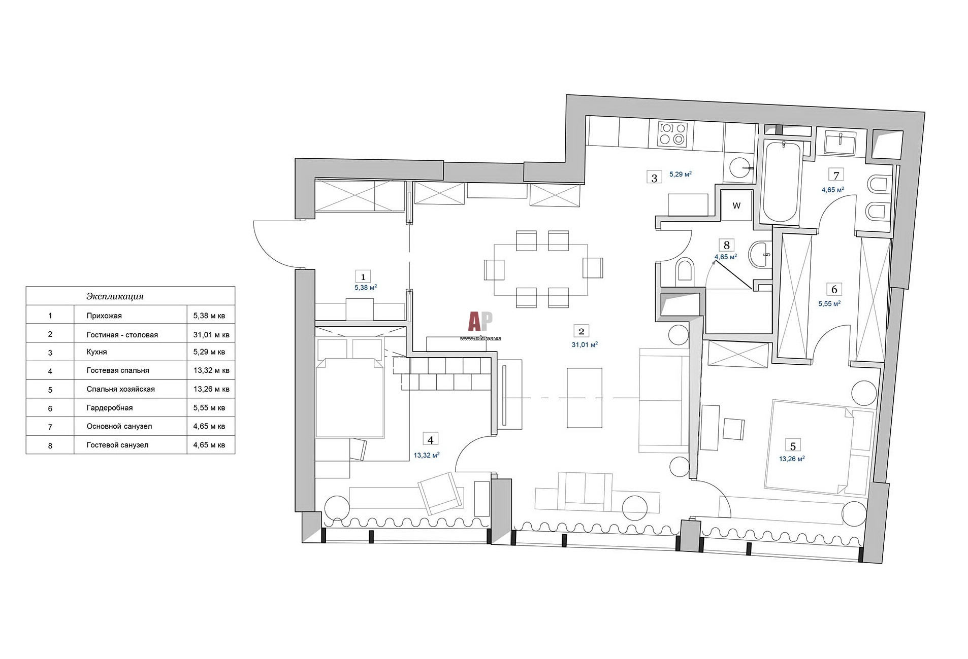 План 3-х комнатной квартиры в ЖК «Сколково-Парк». Общая площадь, 83 кв. м.