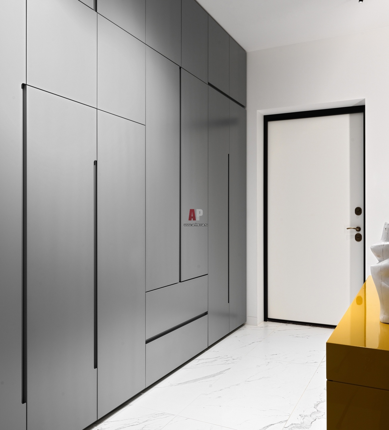 Прихожая оформлена в серой гамме. Встроенный шкаф с интересной геометрией фасадов выполнен на заказ, изготовление, «АФ Ника».