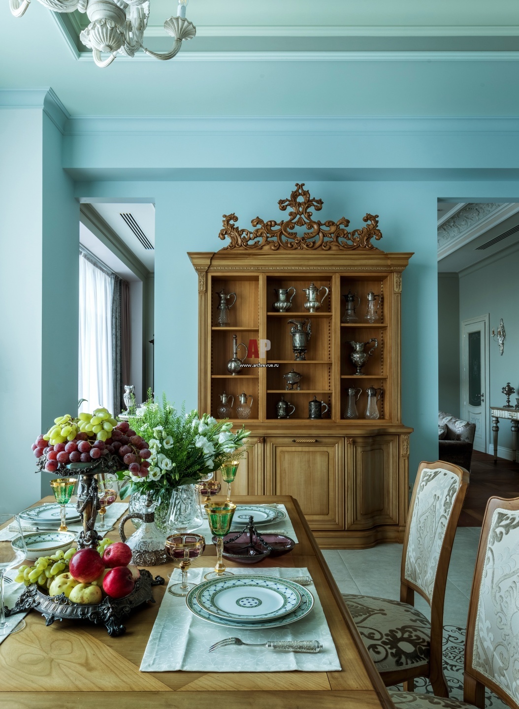 Интерьер столовой. Обеденный стол и стулья, Prestige, модель Capricci. Резной буфет Prestige, модель Regina. На открытых полках буфета выставлена коллекция парных антикварных кувшинов.