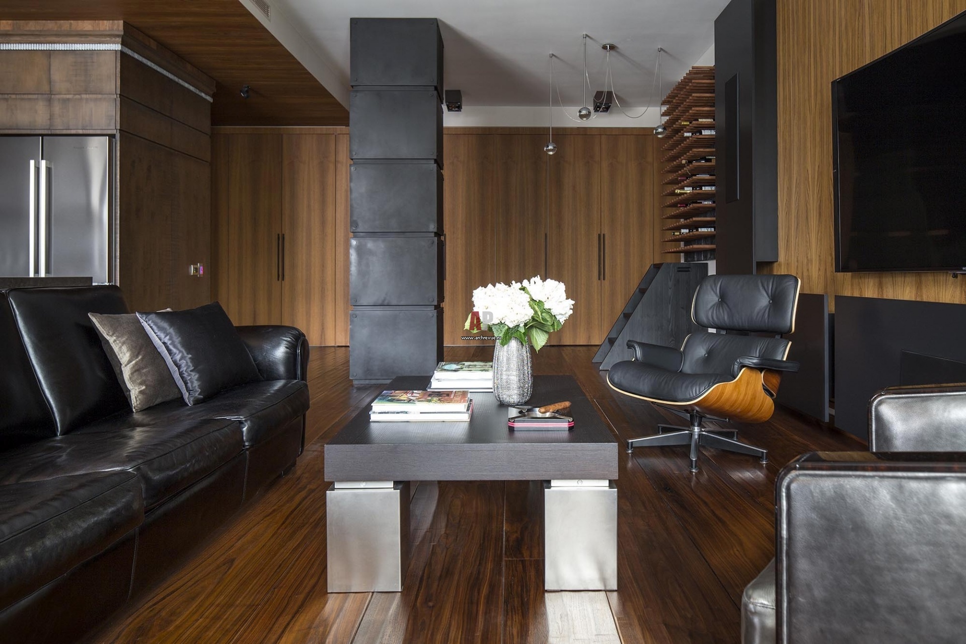 Зона гостиной. Колонны зашиты панелями из черной стали. Кресло с банкеткой Lounge Chair and Ottoman дизайна Чарльза и Рэйм Имз, Vitra.
