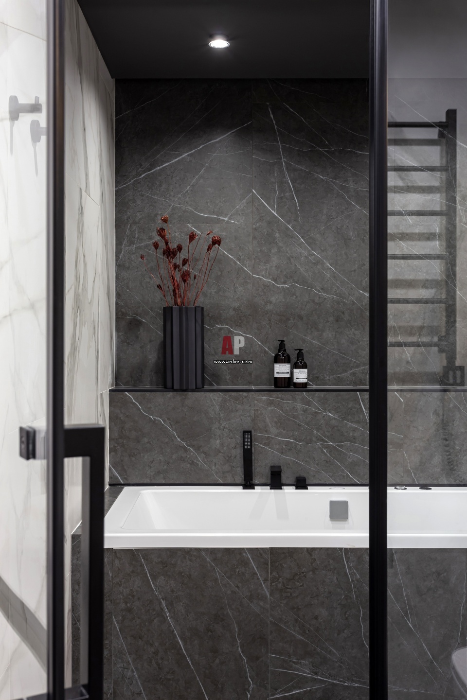 Хозяйская ванная комната оформлена в темной серо-графитовой палитре. Ванна, Villeroy & Boch.