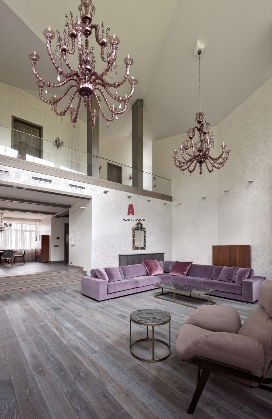 Центральные акценты гостиной – венецианские люстры Arte di Murano из цветного стекла. Они придают интерьеру индивидуальный облик и масштабируют пространство.