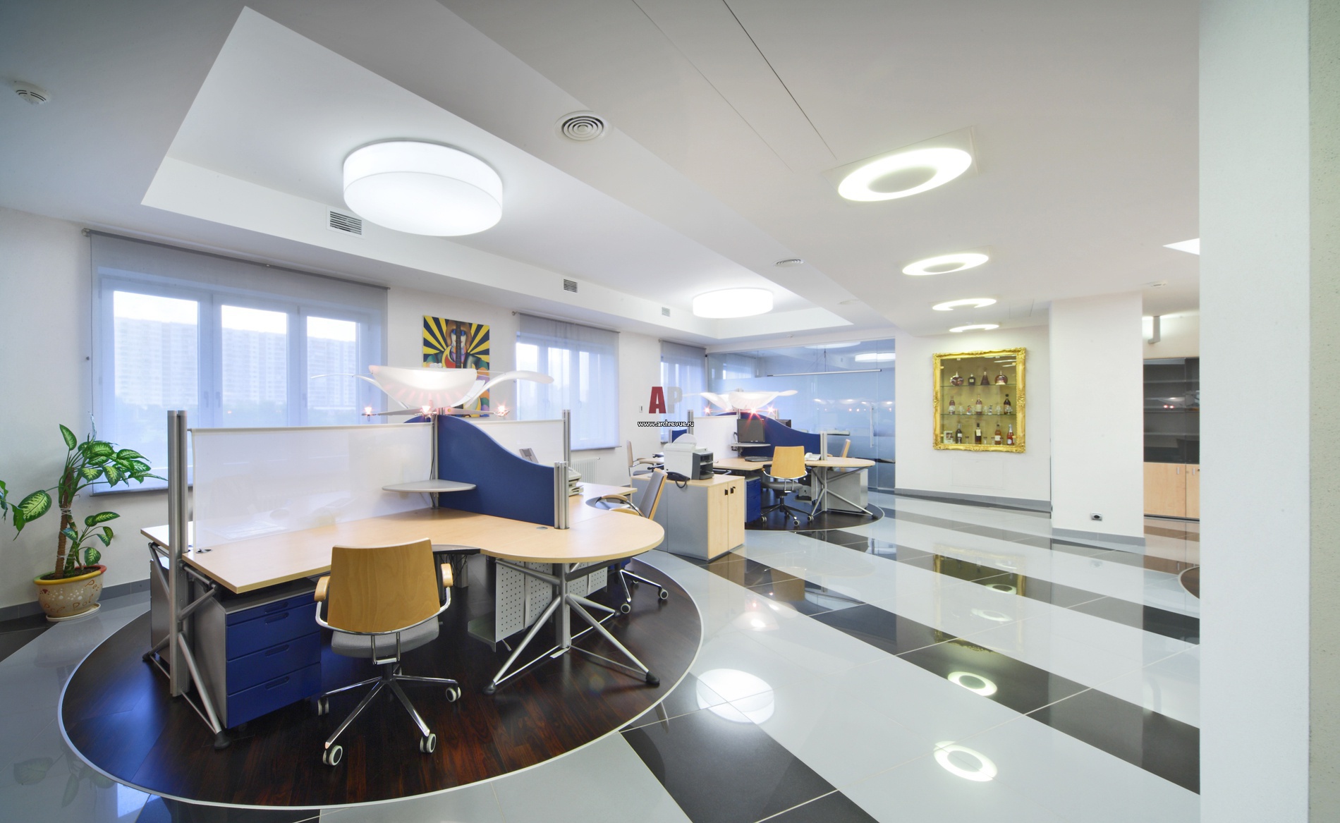 Рабочая зона выполнена на принципу open-space. Полы выложены светлым глянцевым керамогранитом с блестящими вкраплениями. Рабочие «острова» сотрудников акцентированы вставками из ламината.