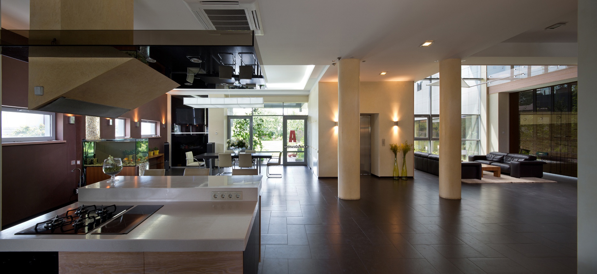 Общая зона гостиной с лифтом. Кухня, мягкая зона, столовая группируются вокруг авторского камина.