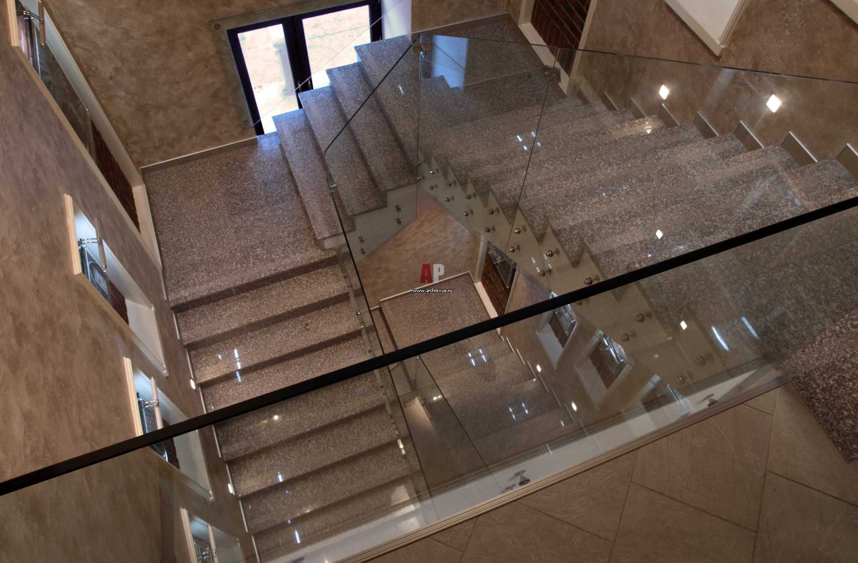 Ограждение лестницы выполнено из стекла, скрепленного металлической фурнитурой, изготовление «Астарта ». Благодаря отсутствию перил лестница словно парит в воздухе.