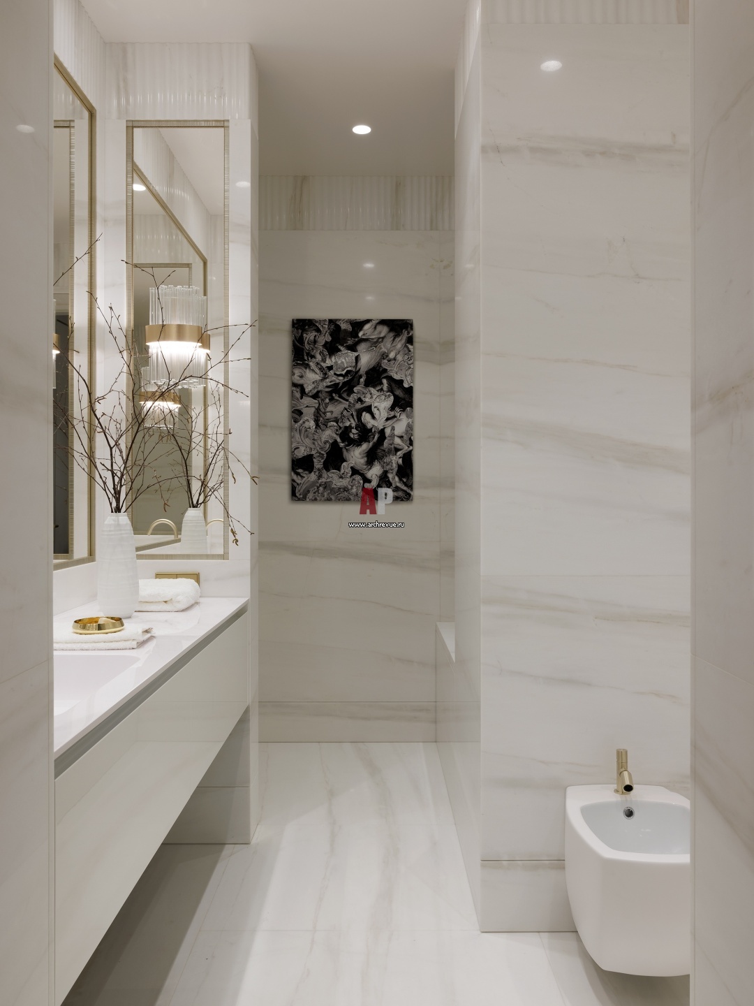 Особенность оформления мастер-ванной – рельефные мраморные карнизы. Картина Дмитрия Сироткина.