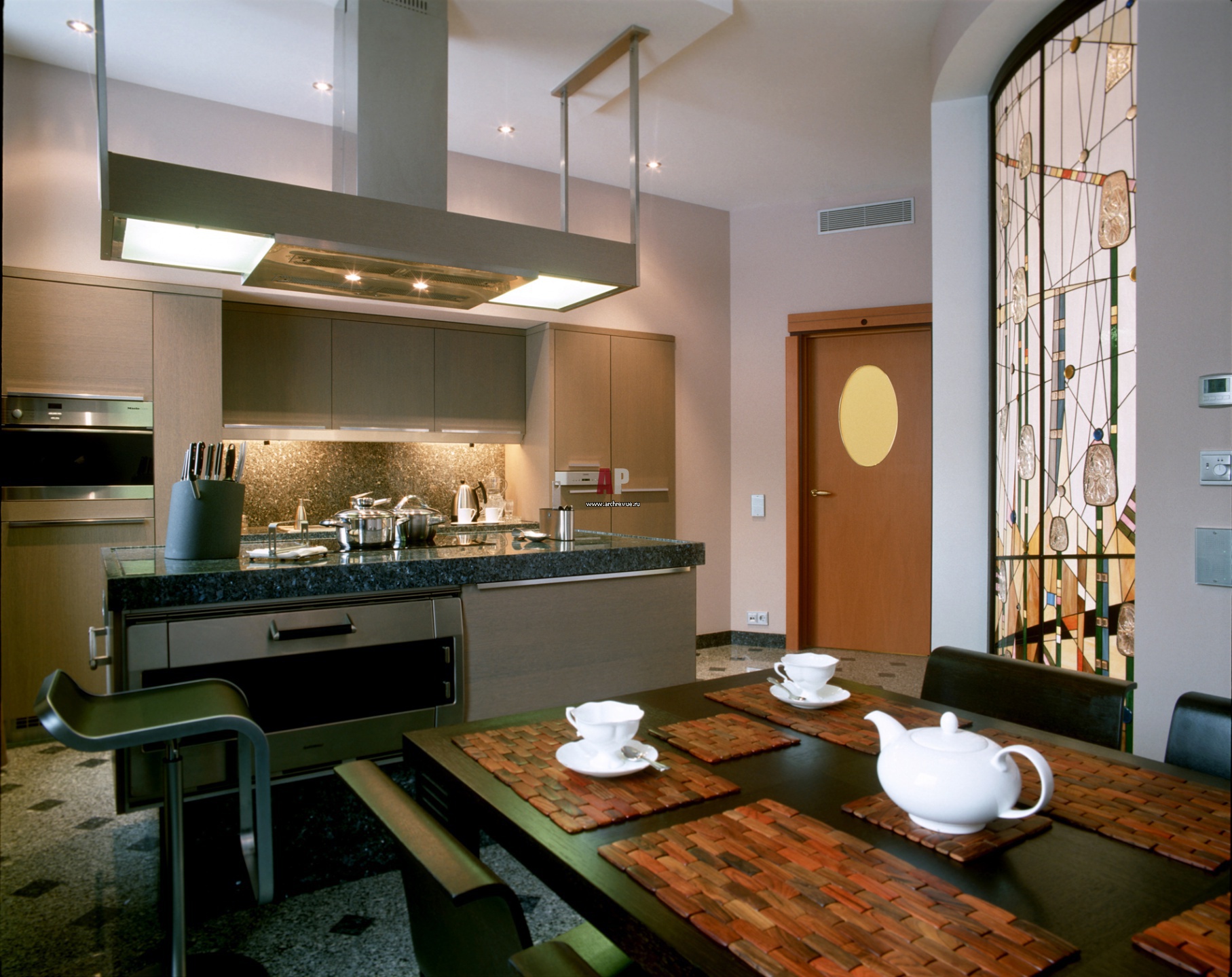 Кухня в современном стиле. В полукруглую стену между библиотекой и кухней встроен цветной витраж с изображением ирисов. Техника, Gaggenau.
