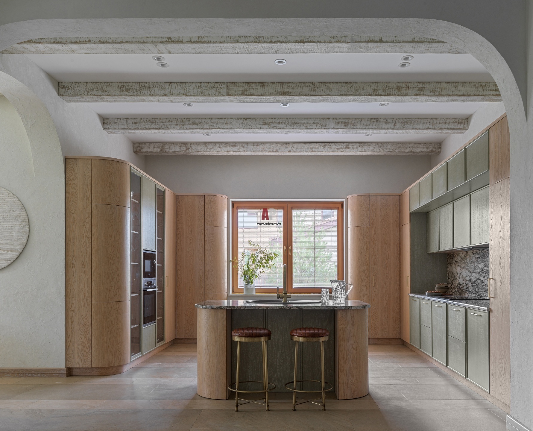 Потолок кухни, как и гостиной, оформлен состаренными выбеленными балками. Радиусные фасады кухни и острова смягчают пространство и рифмуются с арками в проходах.
