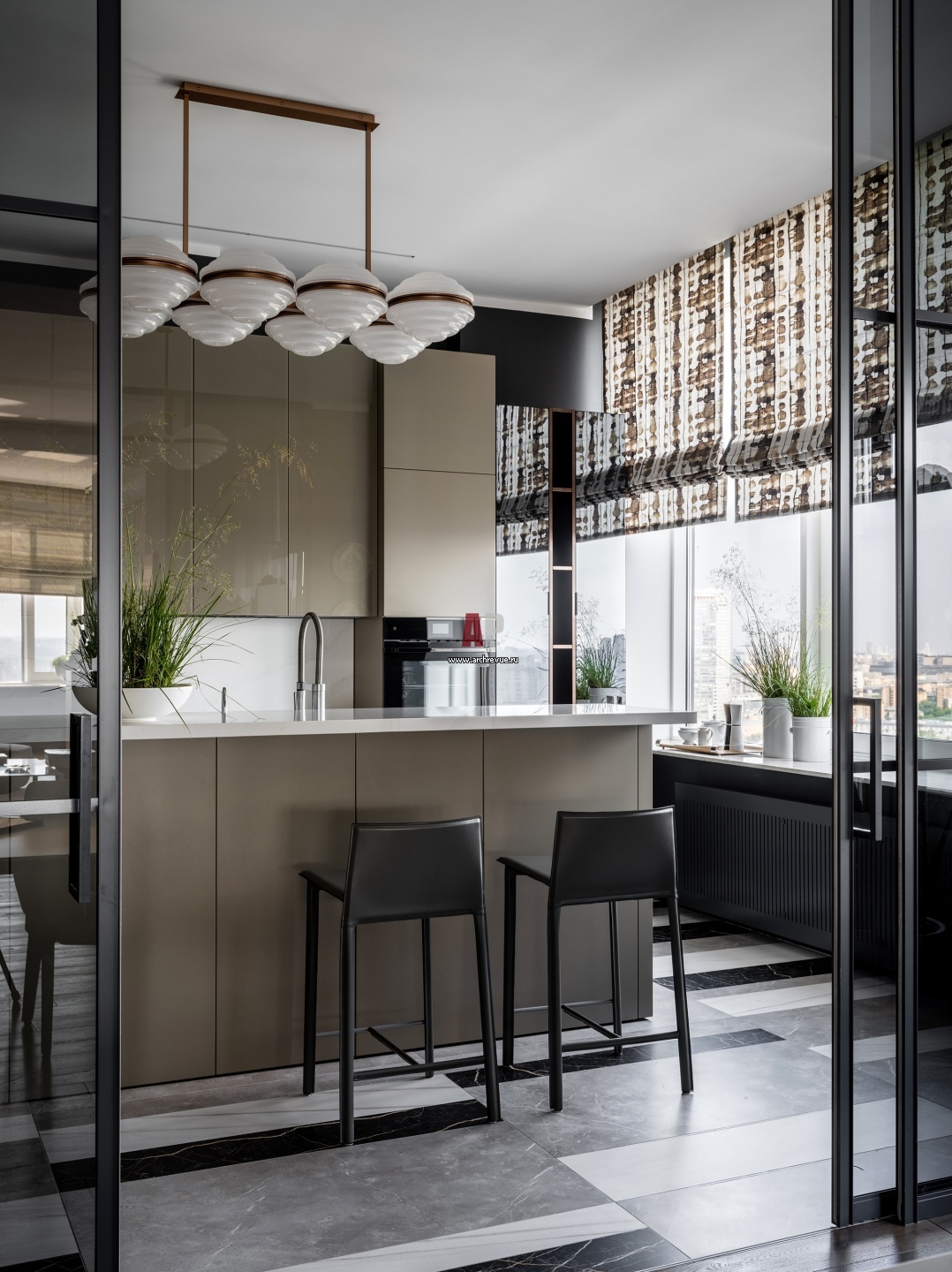 Кухня отделена перегородкой из дымчатого стекла. Кухня, Gulia Novars. Барные стулья, Cattelan Italia. Масштаб поддерживает светильник, Italamp.