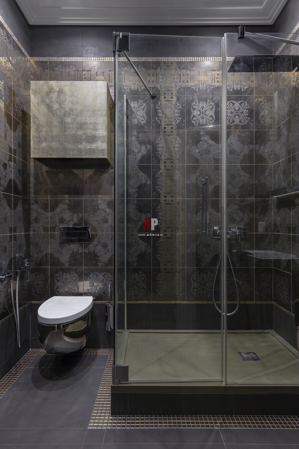 Интерьер гостевого санузла с элементами ар-деко. Унитаз с зеркальной поверхностью, AeT Italia. Душевой поддон, Ceramica Cielo. Навесной шкаф, Toscoquattro.