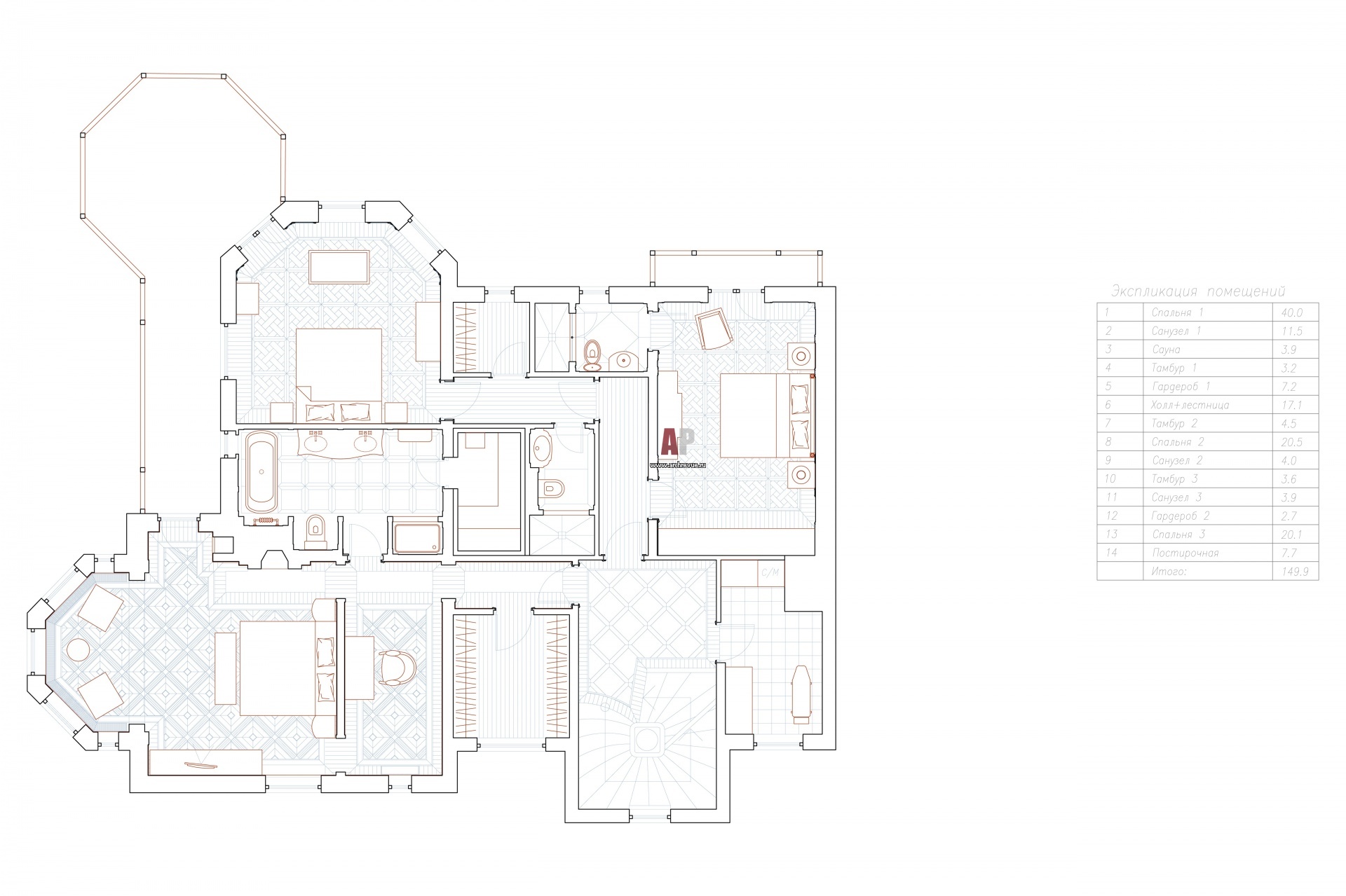 План второго этажа 3-х этажного дома в Подмосковье. Общая площадь – 600 кв. м.