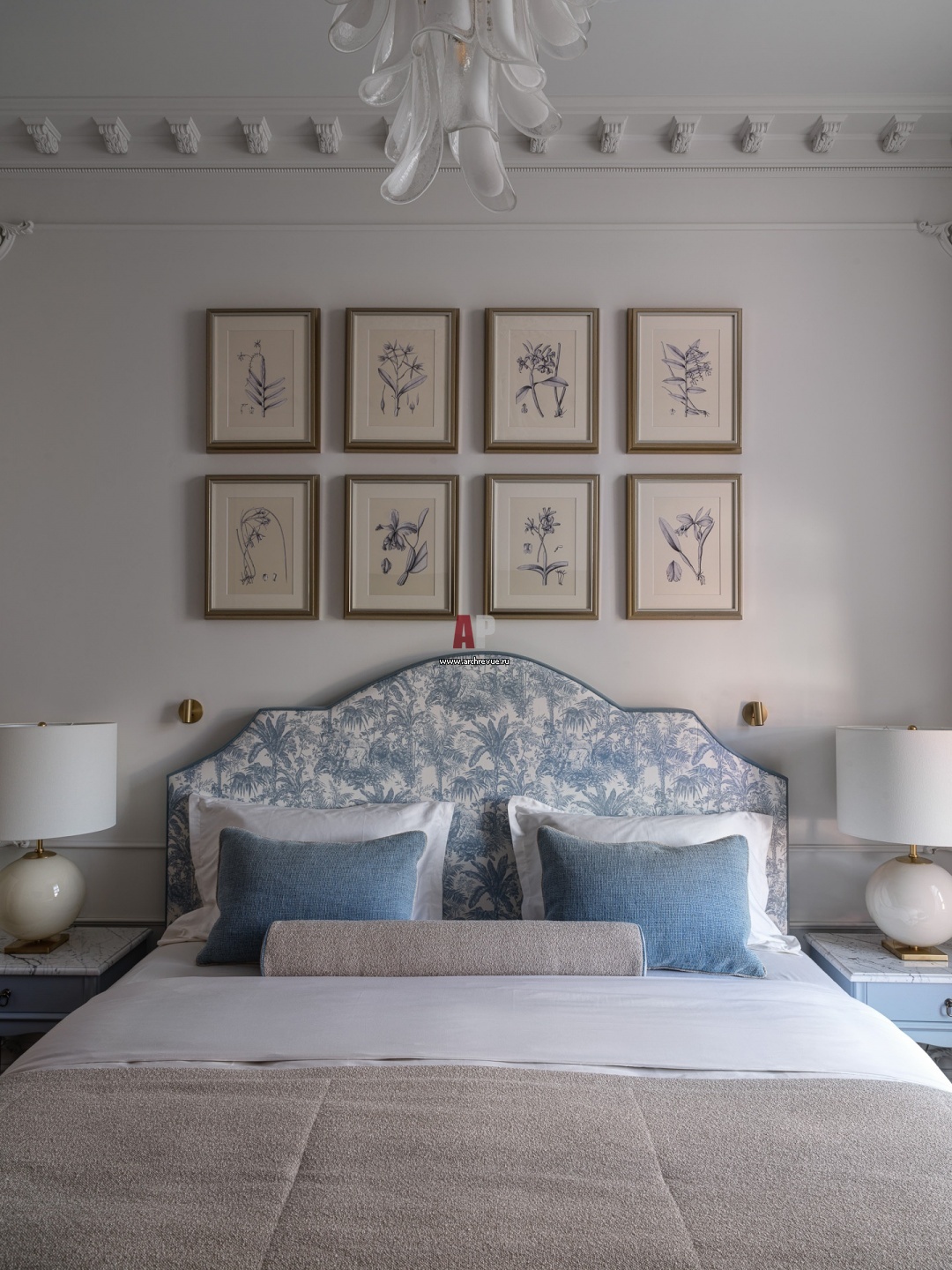 Квартира в стиле французской классики. Интерьер спальни. Настольные лампы, Visual Comfort & Co. На стене – иллюстрации из серии «Орхидеи».