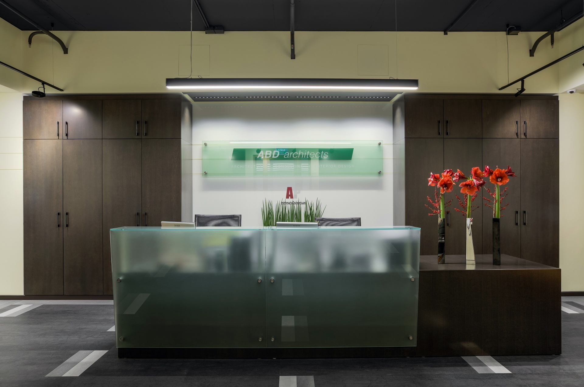 Стойка рецепции облицована темным деревом и стеклом с открытой фурнитурой крепления. Симметричная композиция организована с помощью шкафов из темного дерева для хранения верхней одежды и документации.
