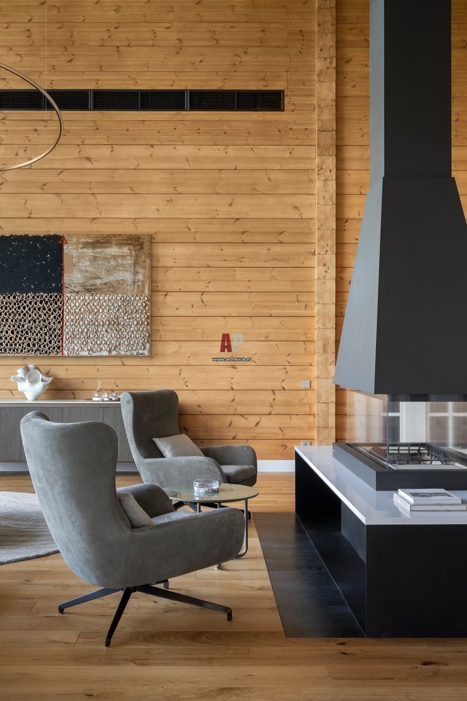 Гостиная с каминной группой. Дровяной камин, Piazzetta. «Смонтировать дымоход с идеальными стыками высотой больше четырех метров на высоте почти шесть метров – такая задача потребовала от монтажников много строительных лесов и ловкости канатоходцев», - рассказывают дизайнеры.