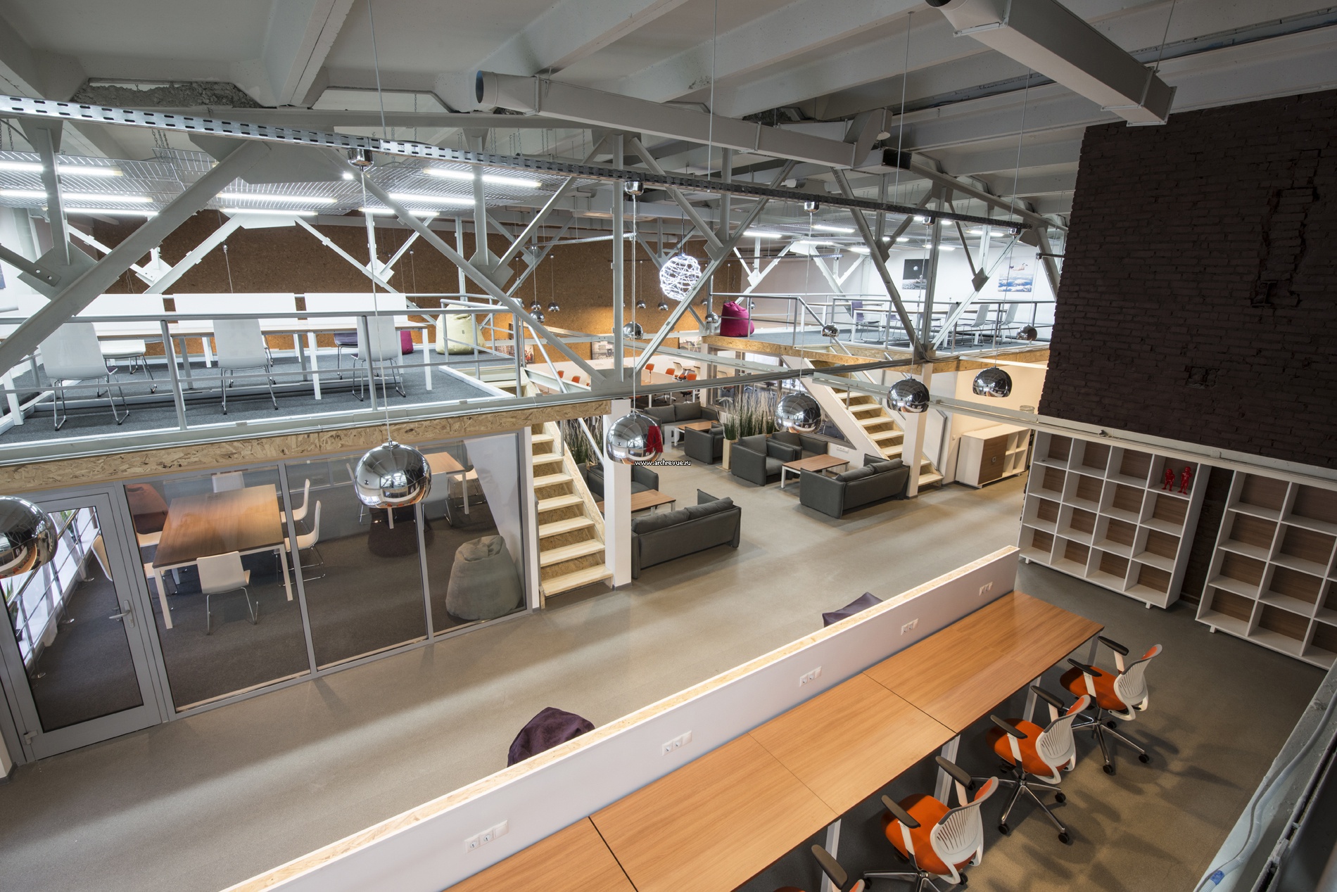 Высота потолков лофта от 4.5 до 6 м в наивысшей точке позволила надстроить четыре локальные платформы из сварных металлоконструкций. Это увеличило полезную площадь с 603 кв. м до 748 кв. м.