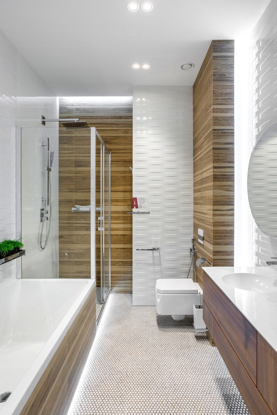 Площадь гостевого санузла составляем 4 кв. м, на ней размещено все самое необходимое. Ванна, Duravit. Душевая система, Noken. Унитаз, Simas. Тумба с раковиной, Burgbad.