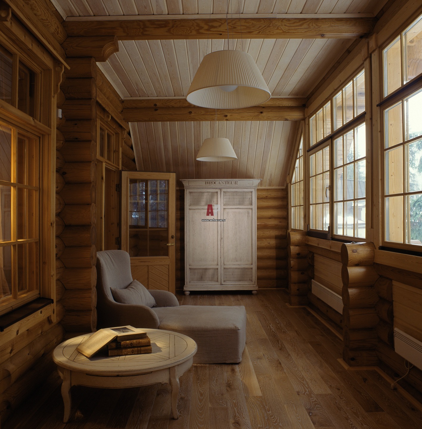 Зона отдыха организована на остекленной веранде. Сюда можно пройти с галереи или из спальни.