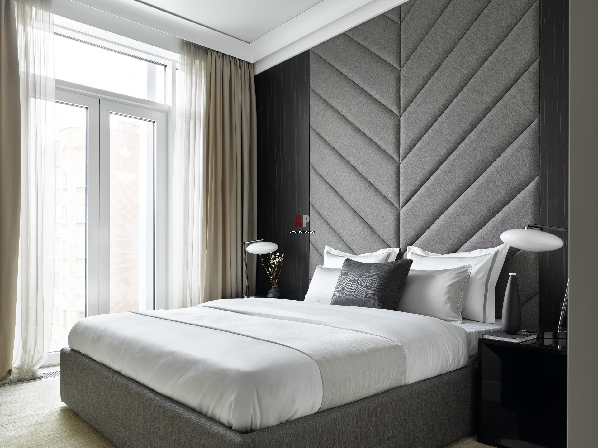 Спальня выглядит камерной за счет плотного декора и высокого изголовья кровами из серой ткани. Стены по обе стороны от кровати зашиты стеновыми панелями из экзотического дерева.
