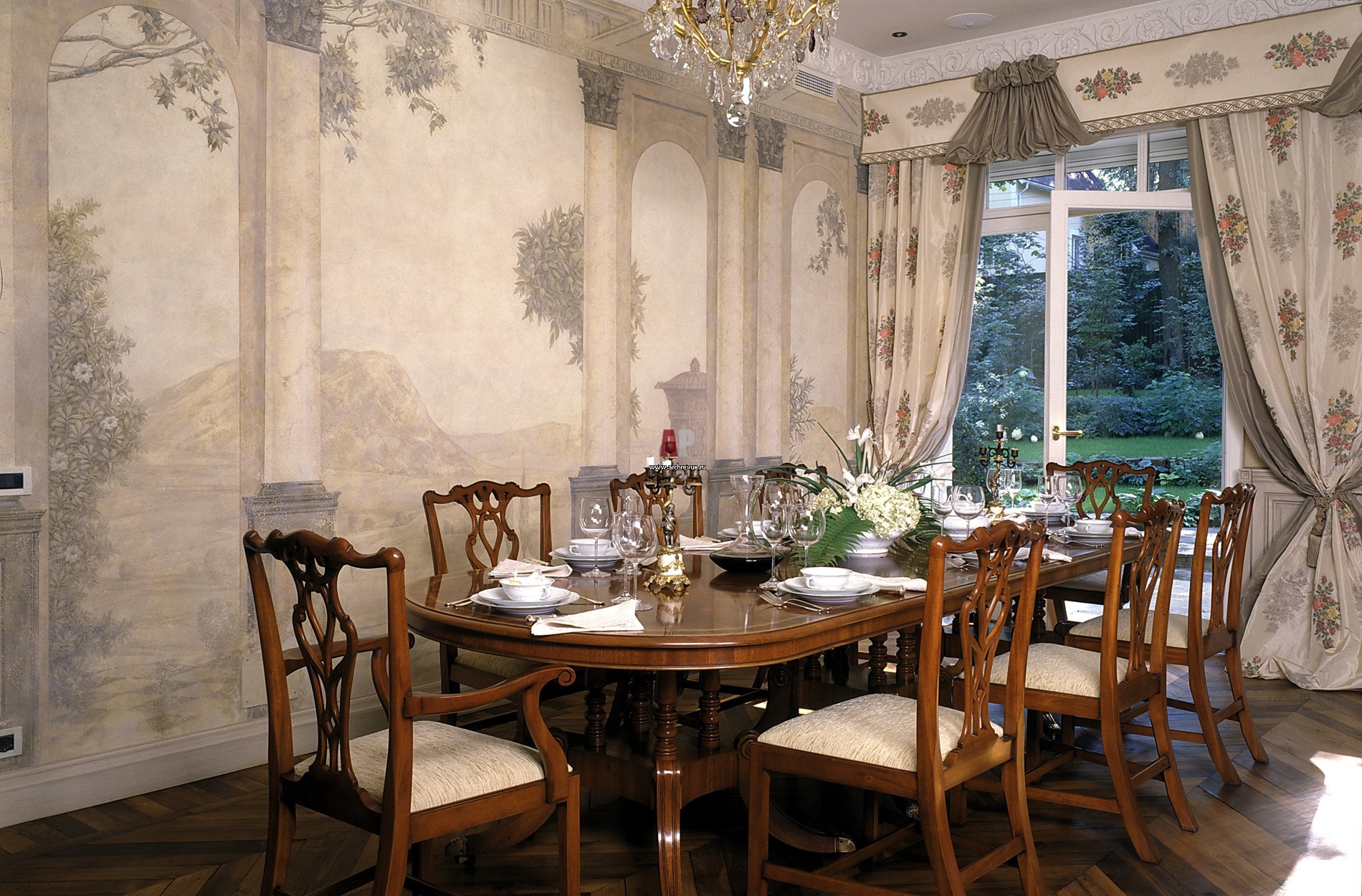 Парадная столовая декорирована настенной росписью-обманкой. Стол и стулья выполнены на фабрике Arthur Brett (Англия). Люстра антикварная, XIX век.