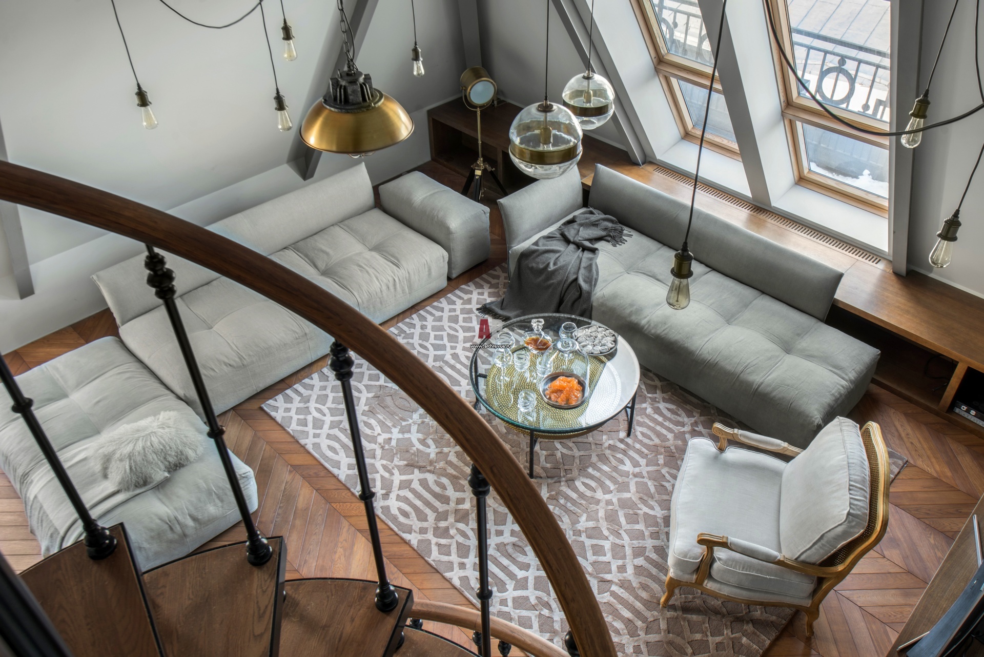 Романтичная мансарда для большой семьи. Интерьер гостиной в серых тонах. Потолочные подвесы на шнурах, Gramercy Home.