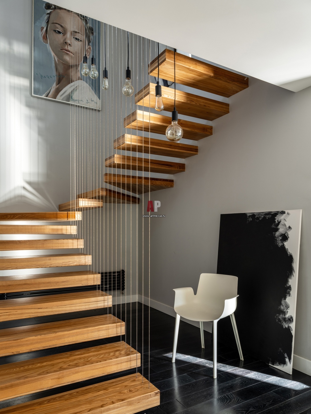 В доме две лестницы. Одна – облегченная конструкция с парящими деревянными ступенями и ограждением из тонких металлических тросов до потолка.