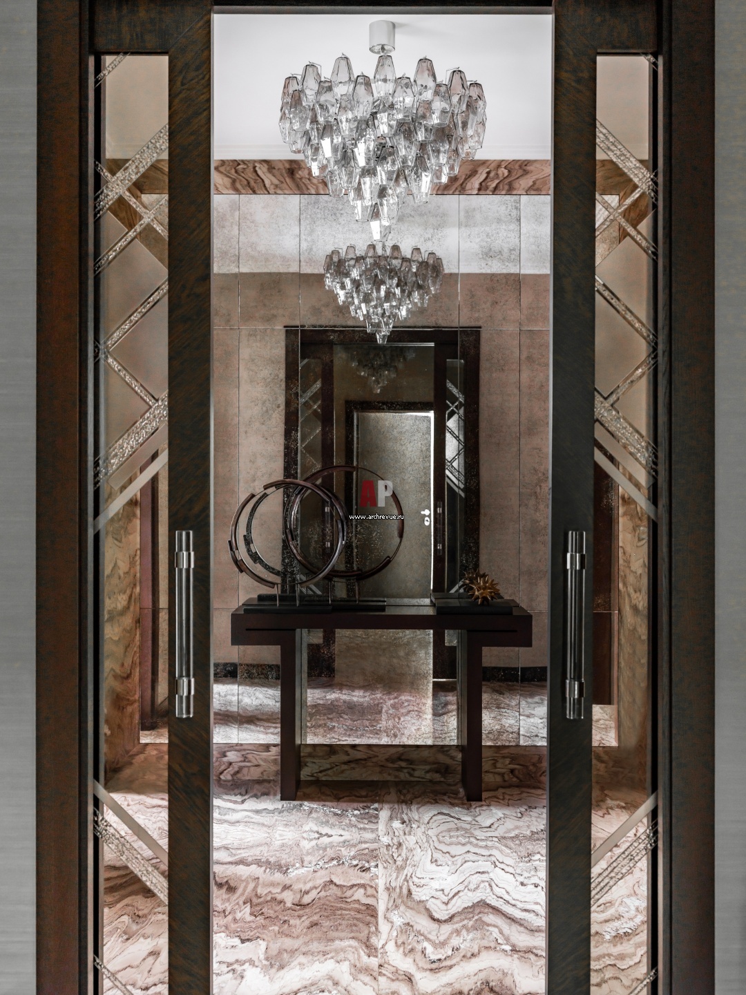 Холл выглядит парадно благодаря дверям из натурального шпона венге с витражами ручной работы. На прямой оси от входа – зеркало из состаренного стекла, сделанное на заказ, и консоль, Porada. Свет, Patrizia Volpato.
